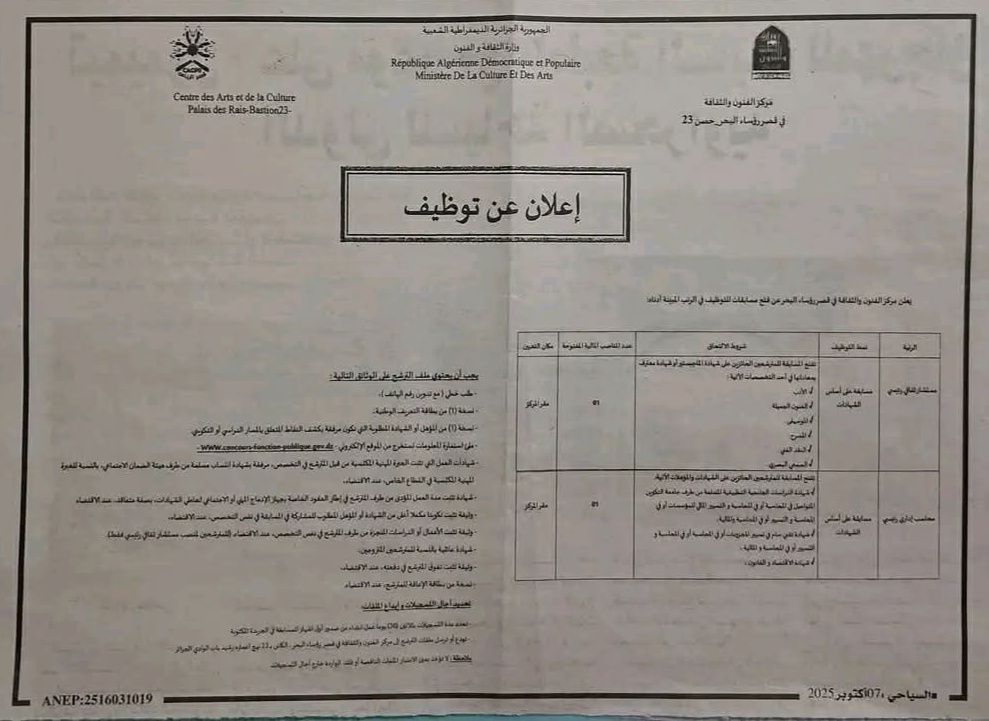 فنـي أو أستاذ في الفنون الجميلة | مسابقة على أساس الشهادة | للمترشحين الحائزين على شهادة ماجستير أو شهادة معترف بمعادلتها في ميدان الفنون الجميلة | — | مقر مركز الفنون والثقافة بقصر رؤساء البحر – الجزائر العاصمة |