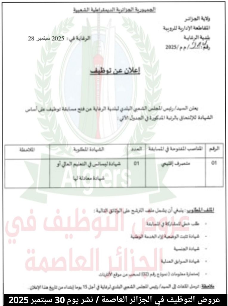 مسابقة توظيف في بلدية الرغاية بالجزائر العاصمة