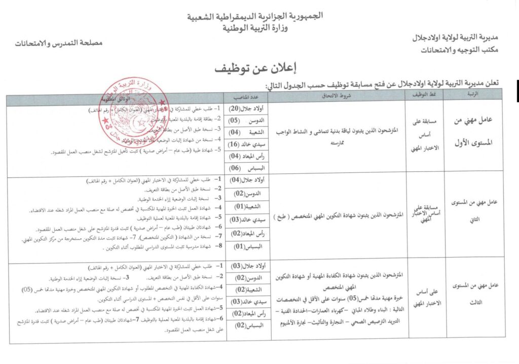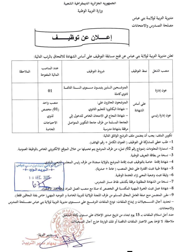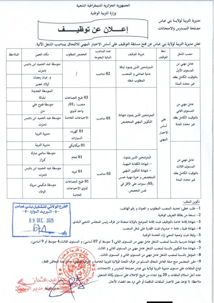تعلن مديرية التربية لولاية بني عباس واولاد جلال عن فتح مسابقة توظيف على أساس الشهادة وعلى أساس الاختبار المهني للالتحاق بالرتب التالية