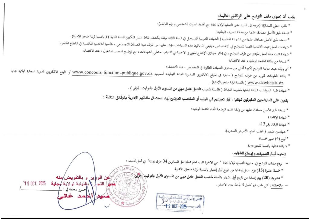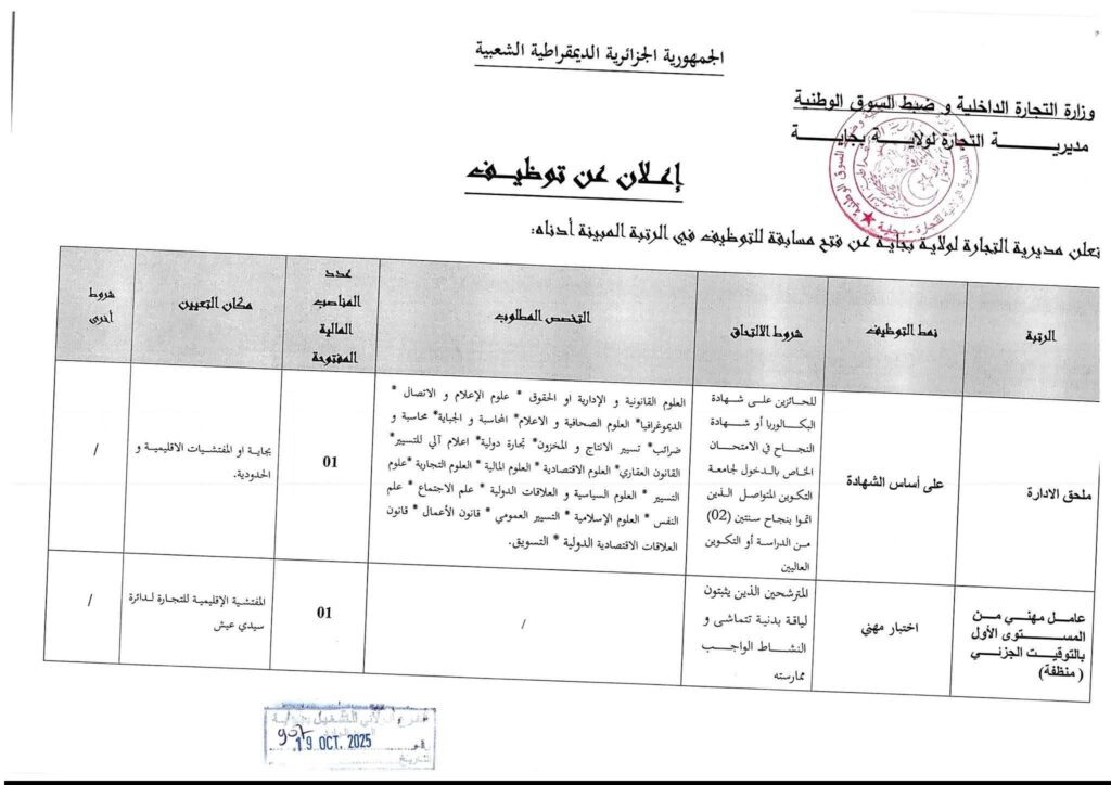 تعلن مديرية التجارة لولاية بجاية عن فتح مسابقة توظيف للالتحاق بالرتب المبينة أدناه:
