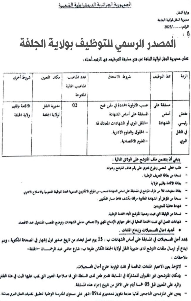مسابقة توظيف في مديرية النقل لولاية الجلفة