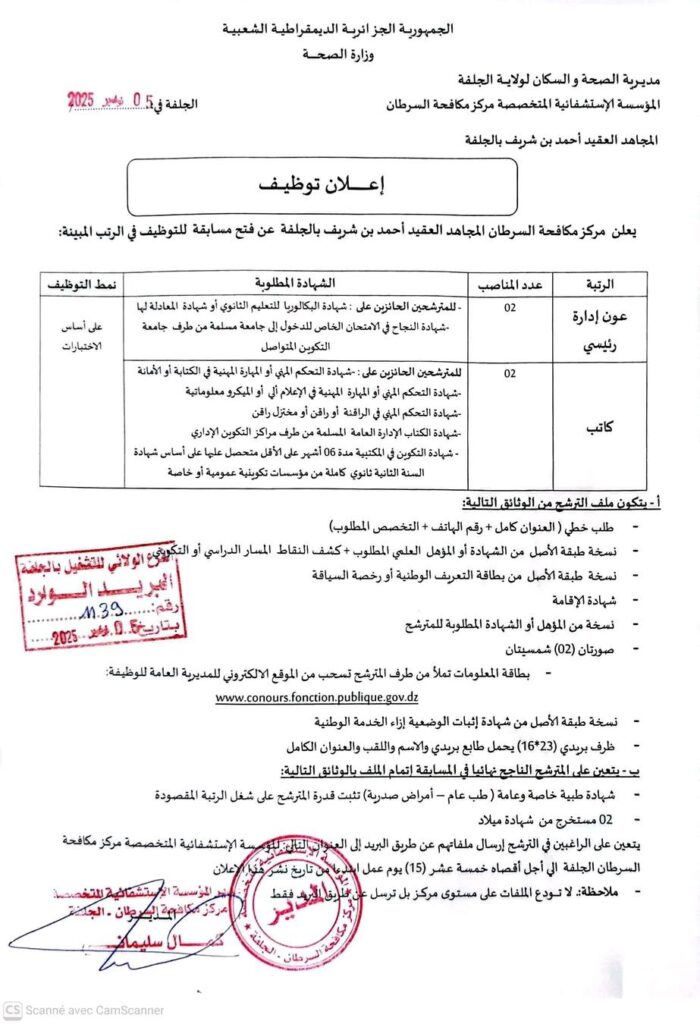 يعلن مركز مكافحة السرطان المجاهد العقيد أحمد بن شريف بالجلفة عن فتح مسابقة توظيف على أساس الاختبارات بعنوان سنة 2025، للالتحاق بالرتبة التالية: