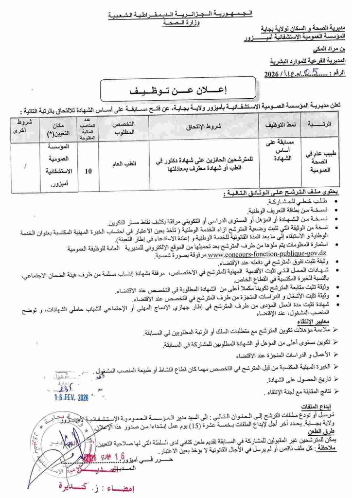 طبيب عام في الصحة العمومية مسابقة على أساس الشهادة للمترشحين الحائزين على شهادة دكتور في الطب أو شهادة معترف بمعادلتها الطب العام 10 المؤسسة العمومية الاستشفائية أميزور /