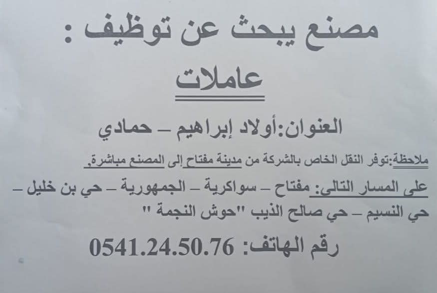 مصنع بأولاد ابراهيم يعلن عن توظيف عاملات