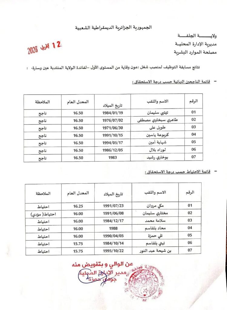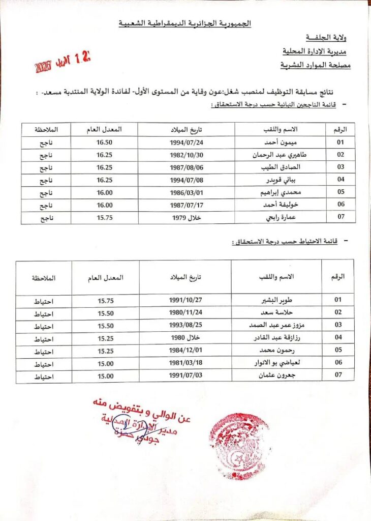 نتائج مسابقة توظيف مديرية الإدارة المحلية الجلفة