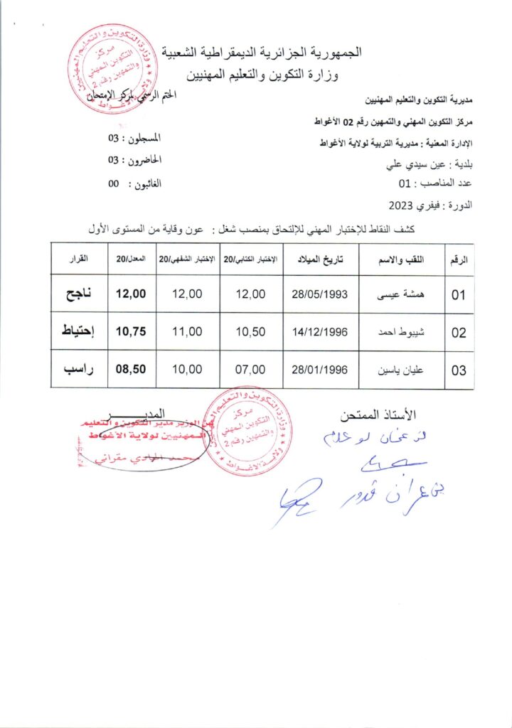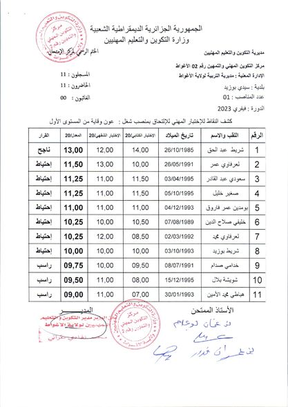 النتائج الأولية لمسابقةالعمال المهنيين رتبة عامل مهني من المستوى الأول بالتوقيت الكامل في إنتظار التدقيق مع مصالح الوظيفة العممية