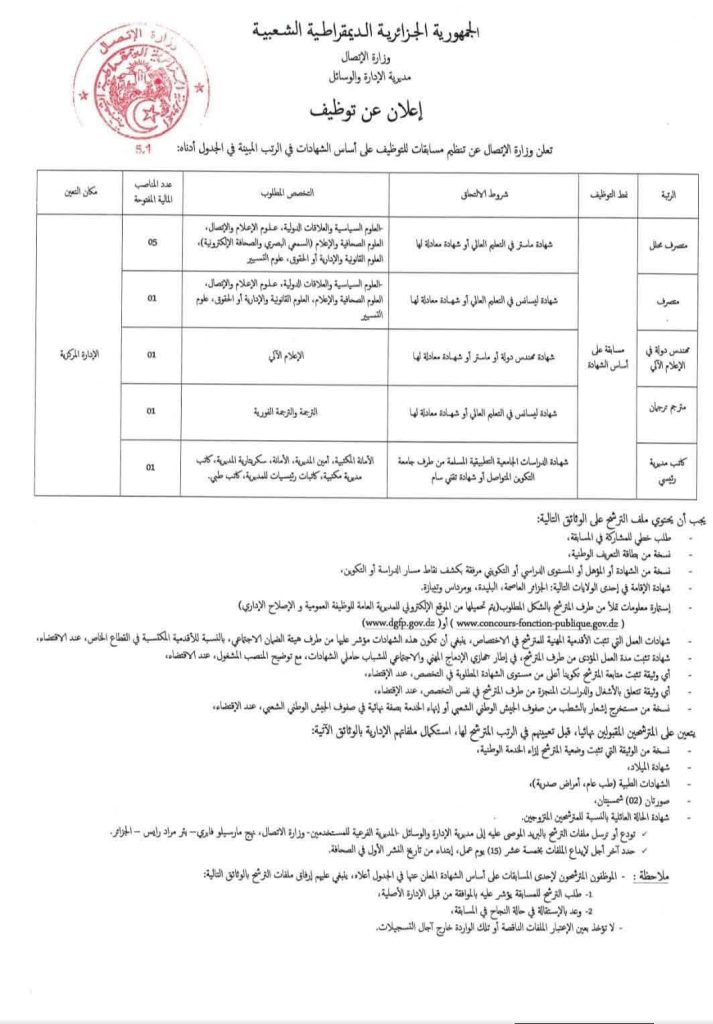 تعلن وزارة الاتصال عن تنظيم مسابقات للتوظيف على أساس الشهادات في الرتب المبينة أدناه: