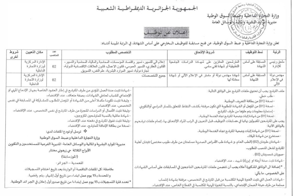 تعلن وزارة التجارة الداخلية وضبط السوق الوطنية عن فتح مسابقة توظيف خارجي على أساس الشهادة للالتحاق بالرتب التالية: