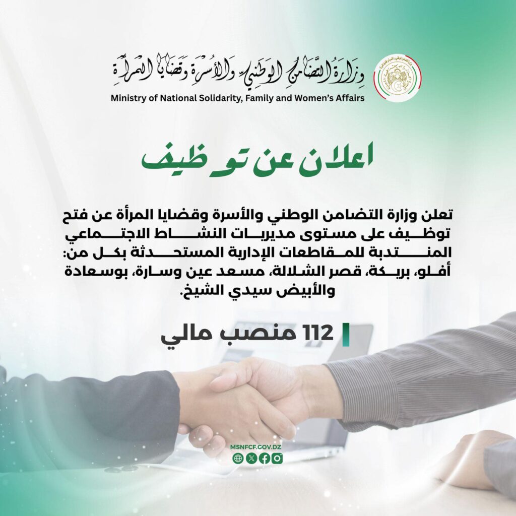 تجسيدا لسياسة الدولة الرامية إلى تعزيز تأطير المقاطعات الإدارية السبع (07) الجديدة بولايات الهضاب العليا بالمورد البشري، لتقريب الإدارة من المواطن وضمان السير الحسن لمصالح القطاع المحلية، و تقديم الخدمات الـمرفقية لمرتاديها، تعلن وزارة التضامن الوطني والأسرة وقضايا المرأة عن إطلاق عملية توظيف على مستوى مديريات النشاط الإجتماعي المنتدبة للمقاطعات الإدارية المستحدثة بكل من : ( أفلو ، بريكة ، قصر الشلالة ، مسعد، عين وسارة، بوسعادة ، الأبيض سيدي الشيخ ).