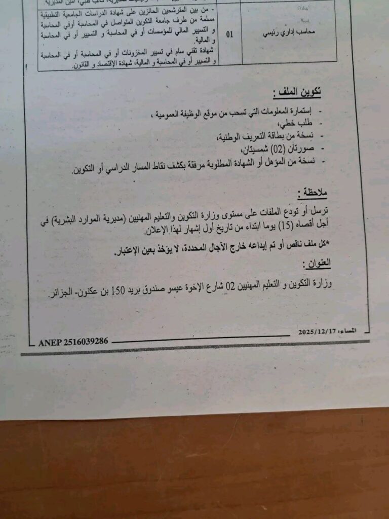 تنظم وزارة التكوين والتعليم المهنيين مسابقات على أساس الاختبارات للتوظيف بعنوان سنة 2025، وذلك لفائدة المصالح المركزية، حسب المناصب المبينة أدناه: