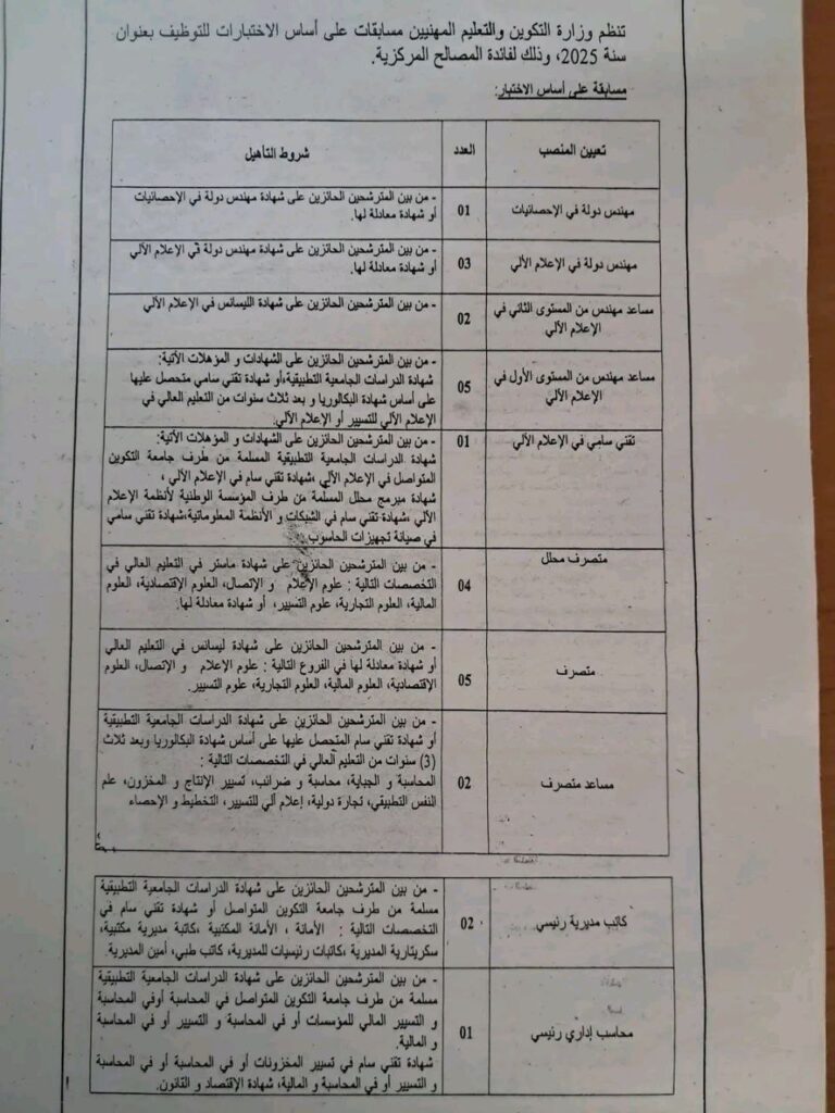 تنظم وزارة التكوين والتعليم المهنيين مسابقات على أساس الاختبارات للتوظيف بعنوان سنة 2025، وذلك لفائدة المصالح المركزية، حسب المناصب المبينة أدناه: