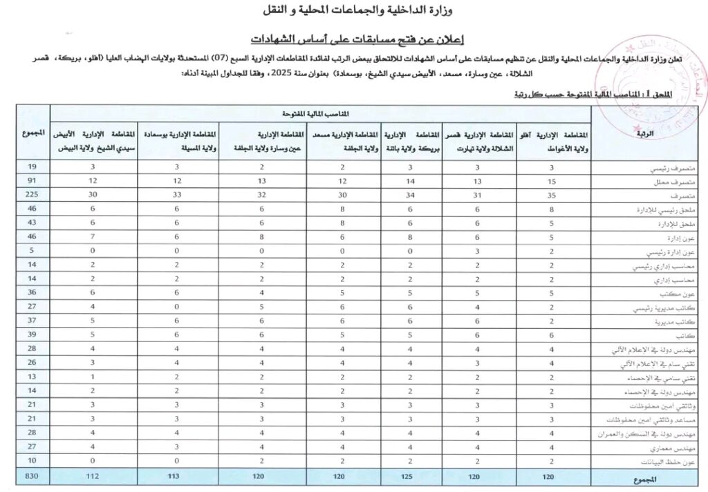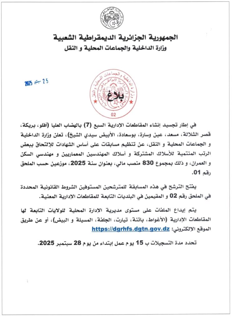 في إطار تجسيد إنشاء المقاطعات الإدارية السبع (7) بالهضاب العليا (أفلو، بريكة، قصر الشلالة، مسعد، عين وسارة، بوسعادة، الأبيض سيدي الشيخ)، تعلن وزارة الداخلية والجماعات المحلية والنقل، عن تنظيم مسابقات على أساس الشهادات للالتحاق ببعض الرتب المنتمية للأسلاك المشتركة وأسلاك المهندسين المعماريين و مهندسي السكن و العمران، و ذلك بمجموع 830 منصب مالي، بعنوان سنة 2025، موزعين حسب الملحق رقم 01.