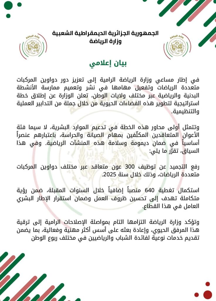 تجدد وزارة الرياضة التزامها بمواصلة الإصلاحات الرامية إلى ترقية هذا المرفق الحيوي، وإعادة بعثه على أسس أكثر مهنية وفعالية، بما يضمن تقديم خدمات نوعية ومستدامة لفائدة الشباب والرياضيين عبر مختلف ربوع الوطن.