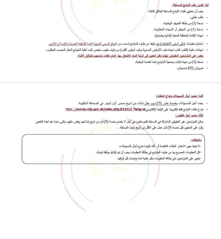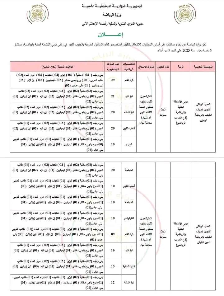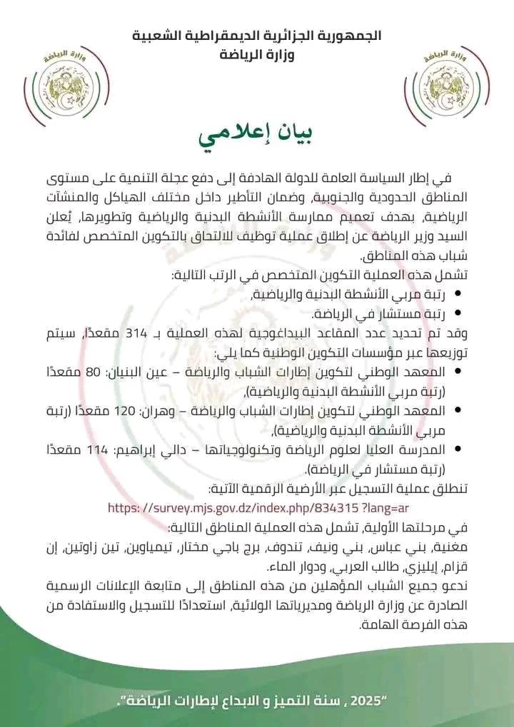 ندعو جميع الشباب المؤهلين من هذه المناطق إلى متابعة الإعلانات الرسمية الصادرة عن وزارة الرياضة ومديرياتها الولائية، استعدادًا للتسجيل والاستفادة من هذه الفرصة الهامة لبناء مستقبل مهني واعد في قطاع الرياضة.