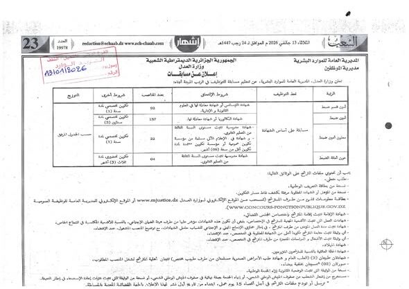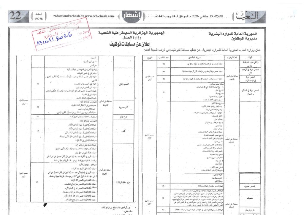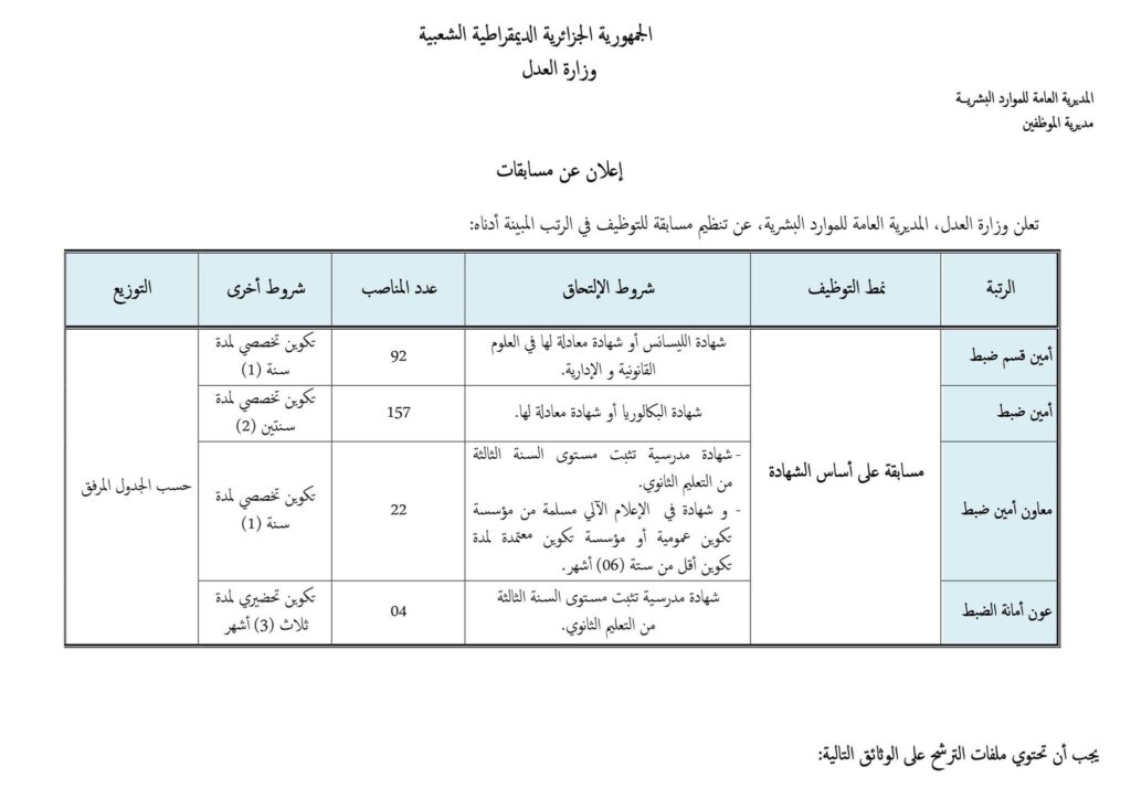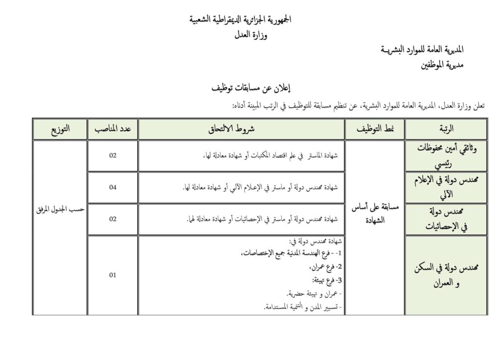 تعلن وزارة العدل، المديرية العامة للموارد البشرية، عن تنظيم مسابقات للتوظيف للالتحاق بالرتب المبينة أدناه، وذلك وفق الشروط والكيفيات المحددة.