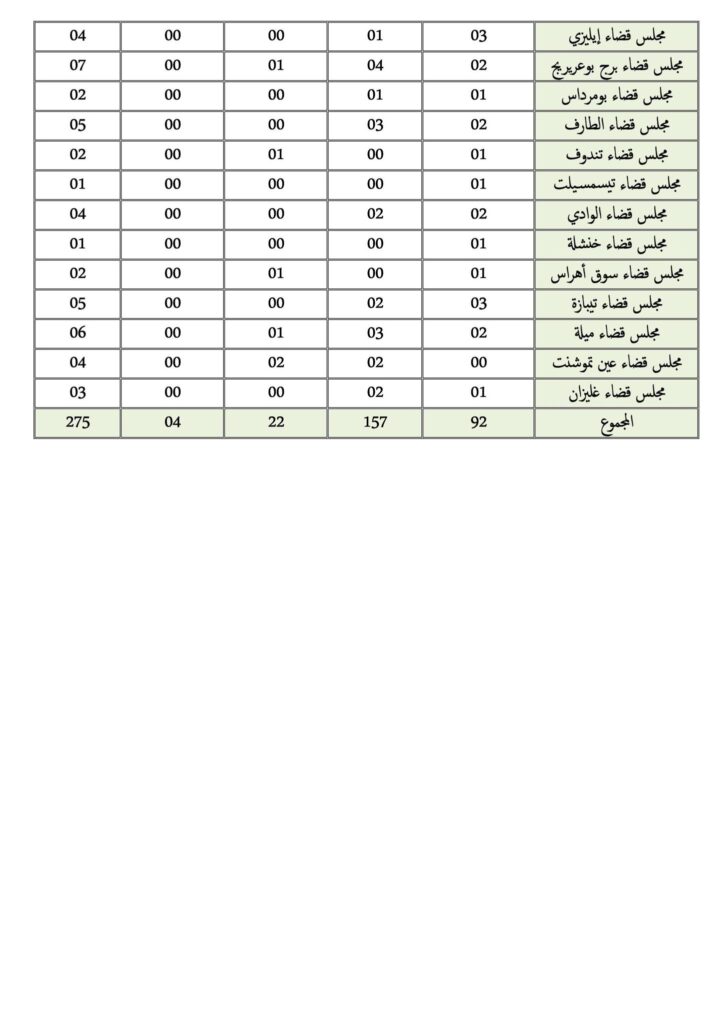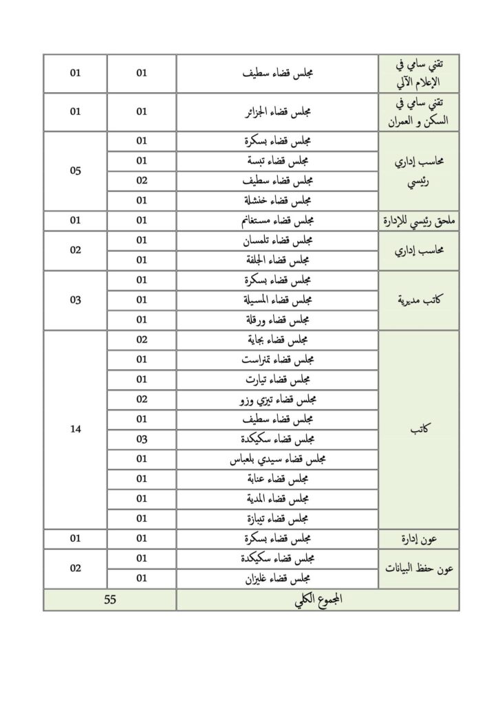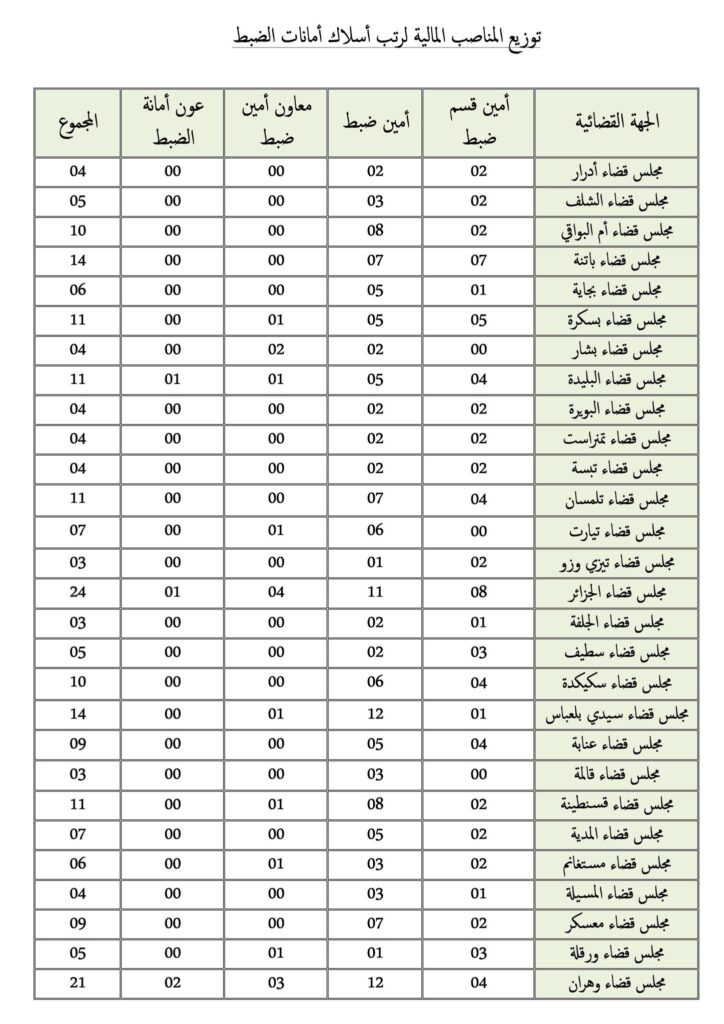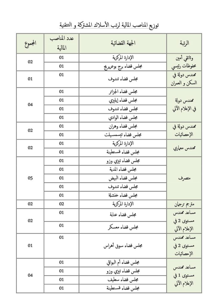 - يحدد عدد المناصب المالية المفتوحة وتوزيعها حسب الرتب والجهات القضائية (المجالس القضائية والإدارة المركزية) وفق الجدول المرفق بالإعلان.