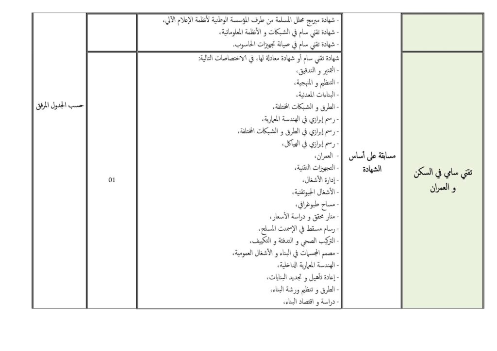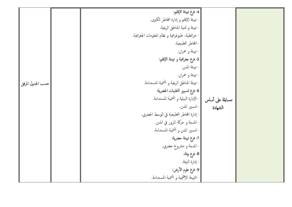 - شهادة مهندس دولة (الهندسة المدنية بجميع الاختصاصات، عمران وتهيئة حضرية، تهيئة الإقليم، الطبوغرافيا ونظم المعلومات الجغرافية، المخاطر الطبيعية… إلخ).