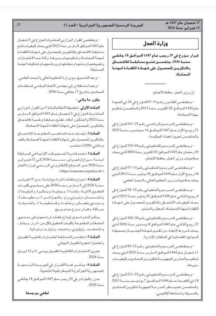 نشرت الجريدة الرسمية للجمهورية الجزائرية قرارًا صادرًا عن وزارة العدل يتضمن فتح مسابقة وطنية للالتحاق بالتكوين المؤهل للحصول على شهادة الكفاءة لمهنة المحاماة.
