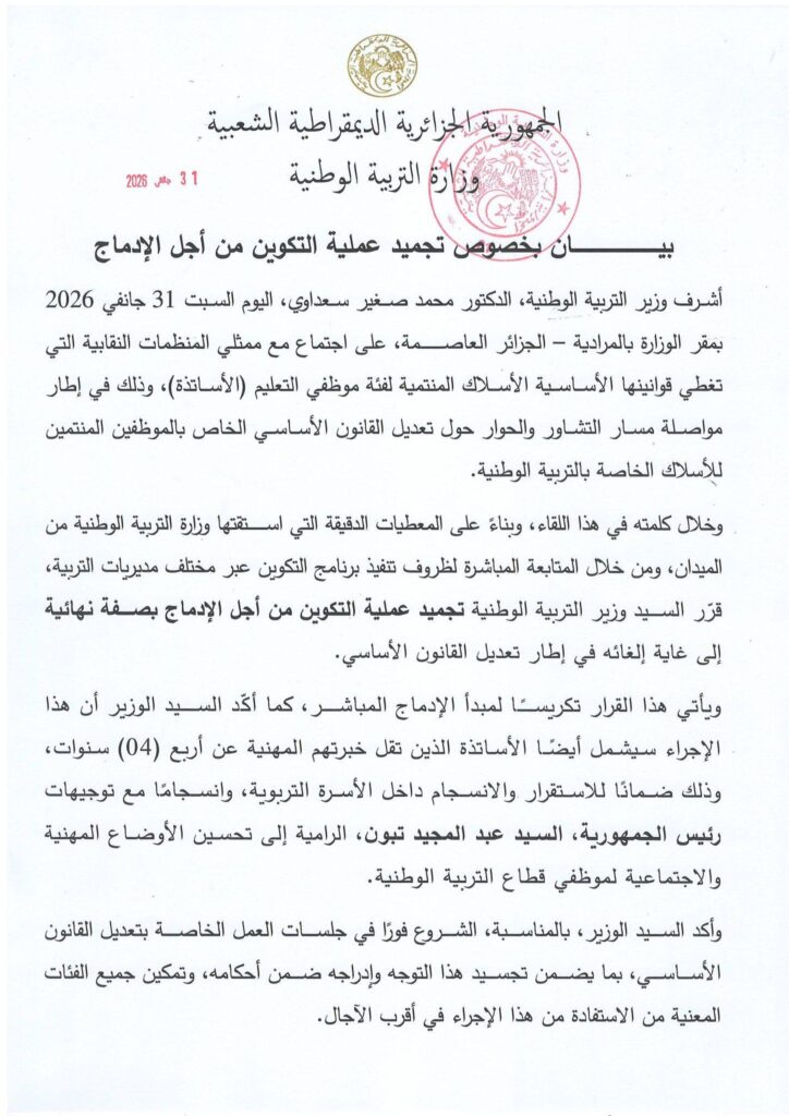 ويأتي هذا القرار تكريسًا لمبدأ الإدماج المباشر، حيث أكّد السيد الوزير أن هذا الإجراء سيشمل أيضًا الأساتذة الذين تقل خبرتهم المهنية عن أربع (04) سنوات، وذلك ضمانًا للاستقرار والانسجام داخل الأسرة التربوية، وانسجامًا مع توجيهات رئيس الجمهورية، السيد عبد المجيد تبون، الرامية إلى تحسين الأوضاع المهنية والاجتماعية لموظفي قطاع التربية الوطنية.