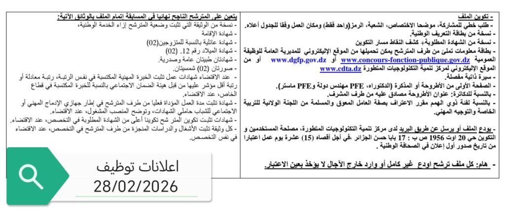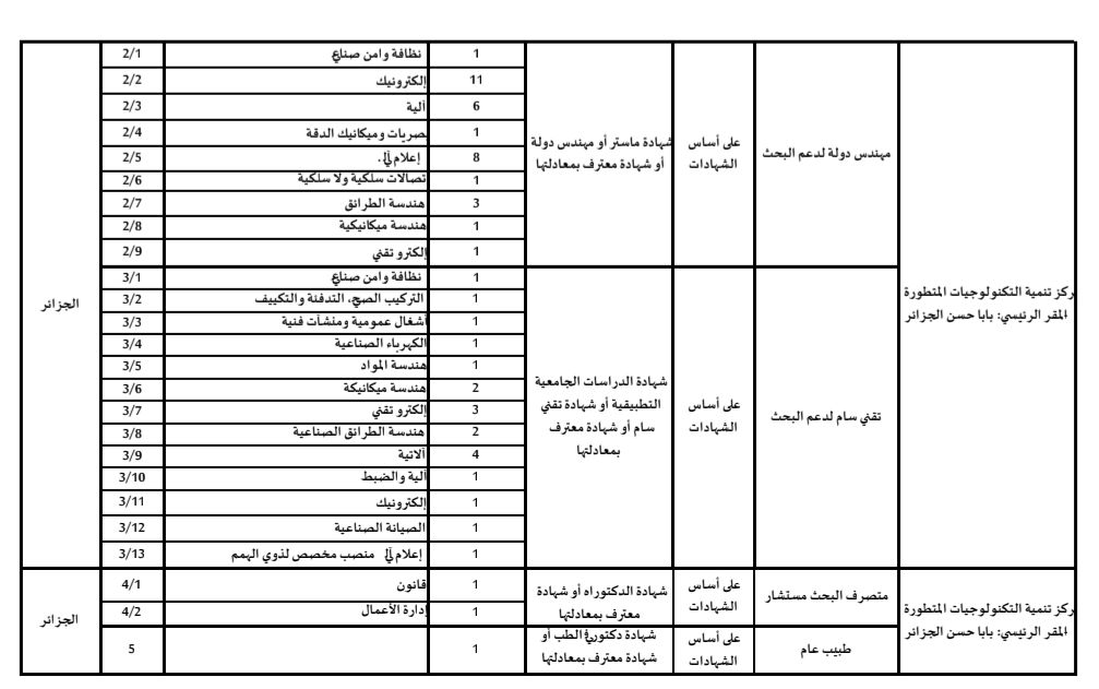 ينظم مركز تنمية التكنولوجيات المتطورة مسابقة على أساس الشهادات، لتوظيف في الرتب والتخصصات الآتية: