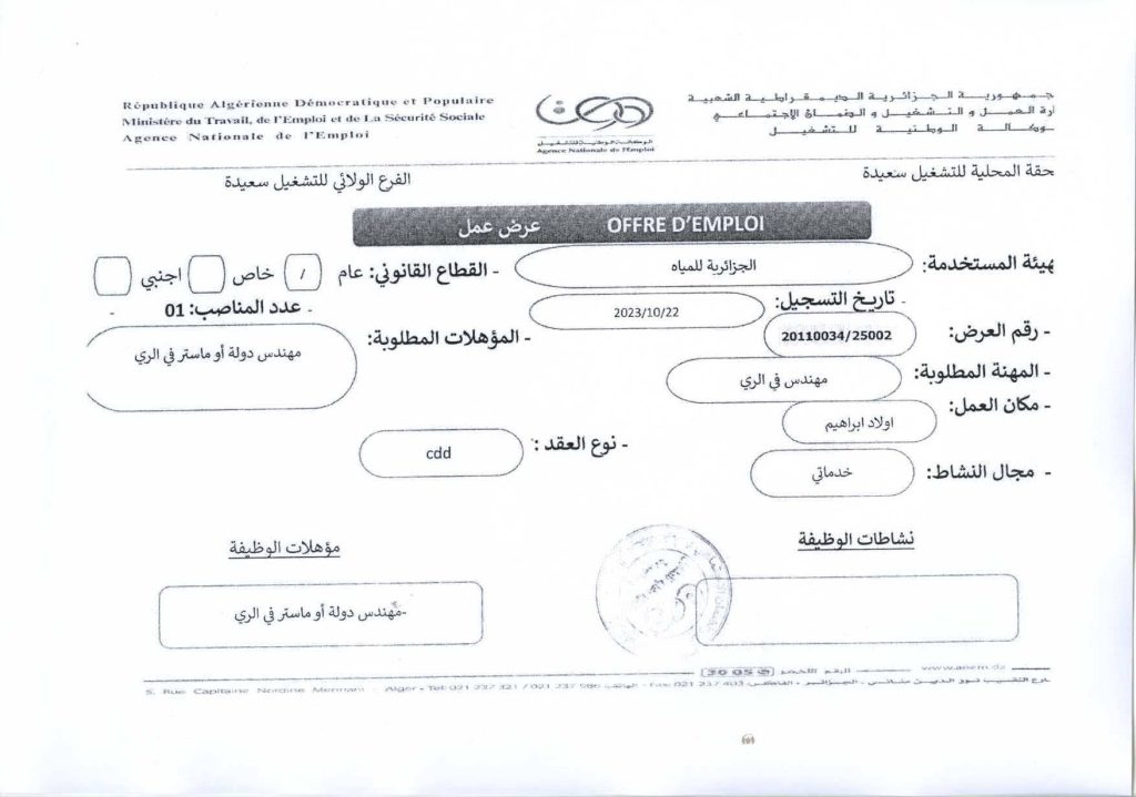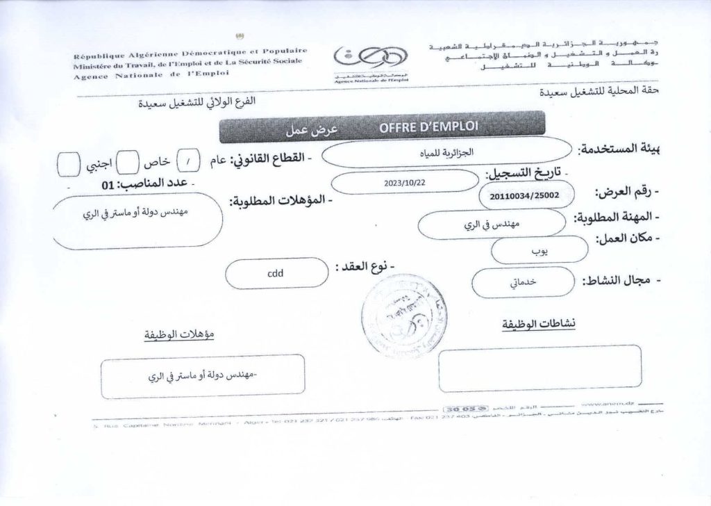 الهيئة المستخدمة: الجزائرية للمياه سعيدة