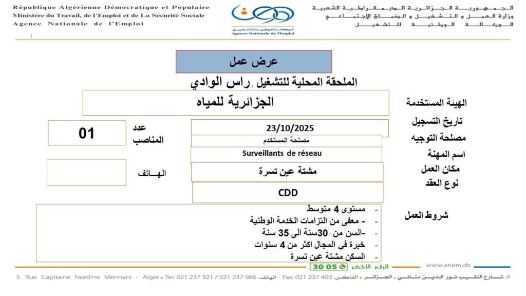 الهيئة المستخدمة: الجزائرية للمياه راس الوادي