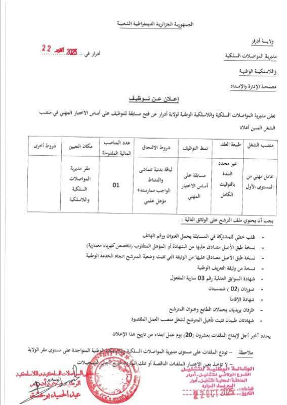 اعلان توظيف بمديرية المواصلات السلكية واللاسلكية الوطنية لولاية أدرار