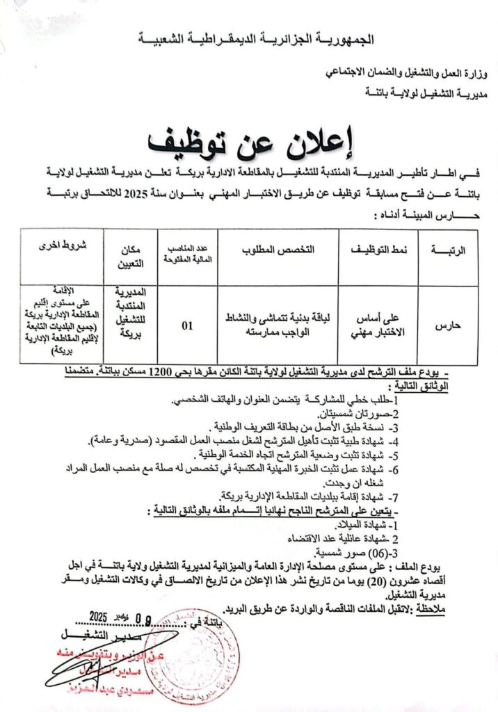 في إطار تأطير المديرية المنتدبة للتشغيل بالمقاطعة الإدارية بريكة، تعلن مديرية التشغيل لولاية باتنة عن فتح مسابقة توظيف عن طريق الاختبار المهني للالتحاق برتبة: