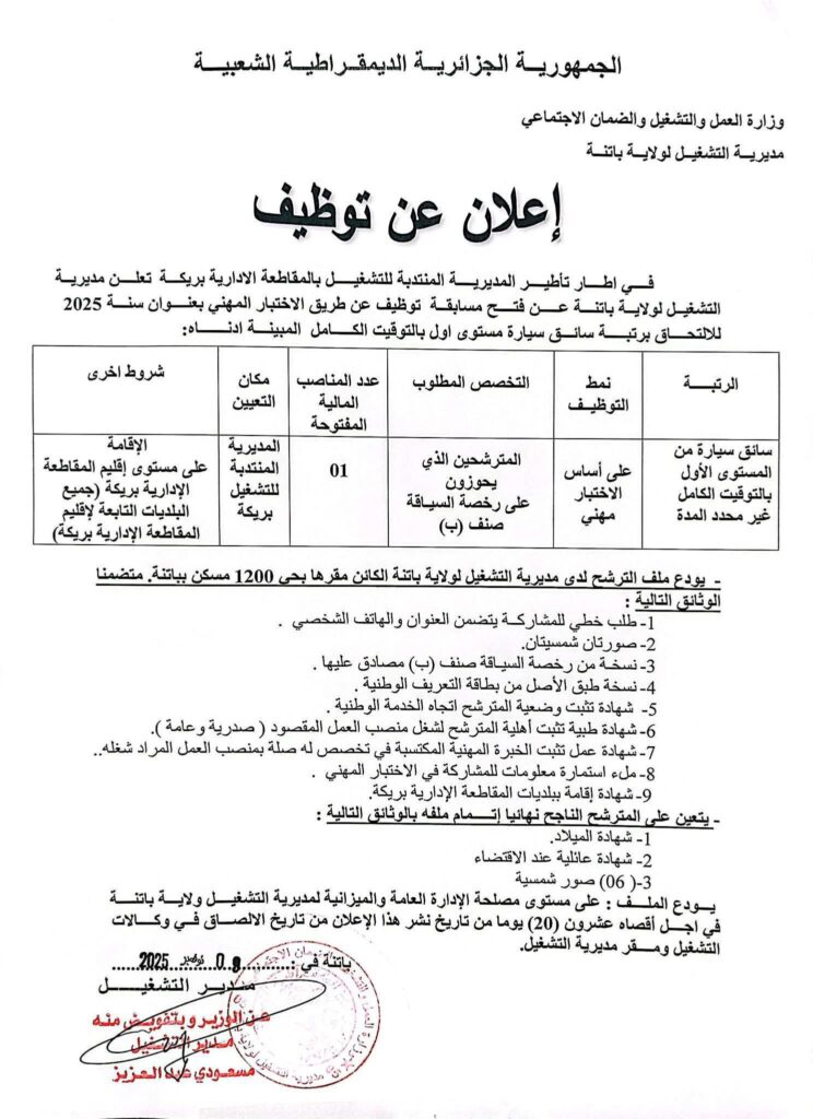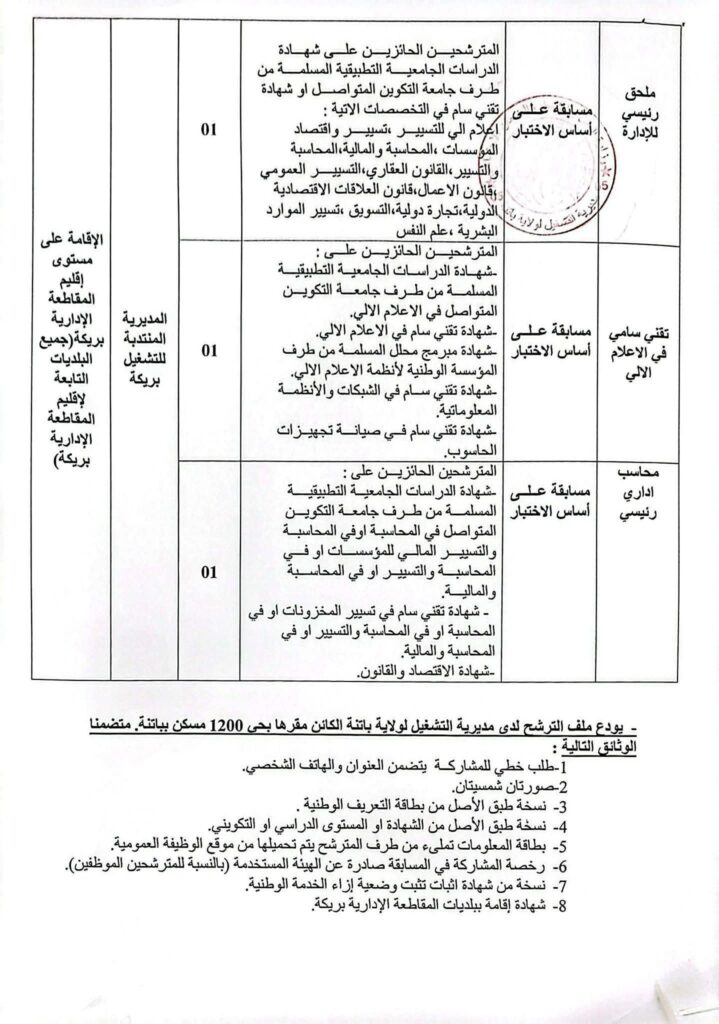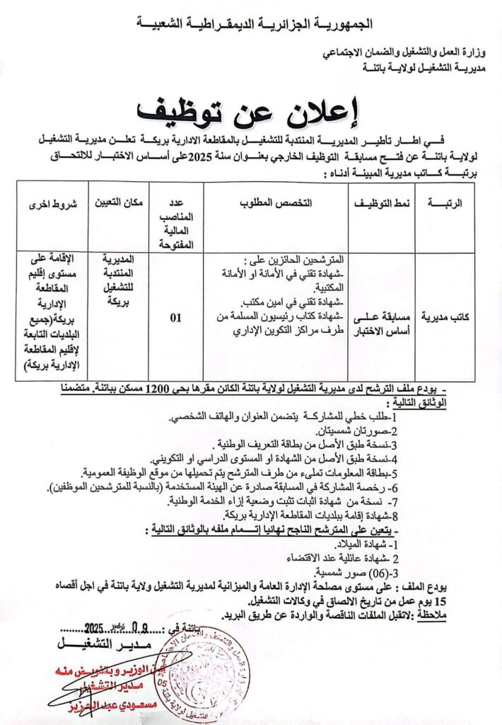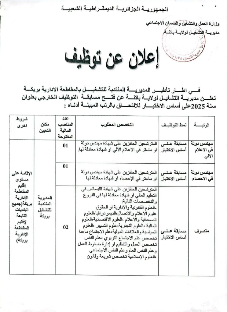 في إطار تأطير المديرية المنتدبة للتشغيل بالمقاطعة الإدارية بريكة، تعلن مديرية التشغيل لولاية باتنة عن فتح مسابقة توظيف عن طريق الاختبار المهني للالتحاق برتبة:
