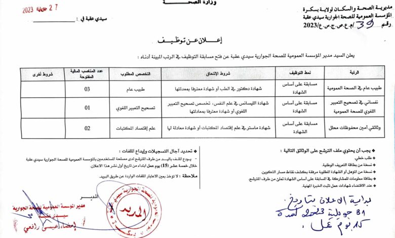 اعلان توظيف بالمؤسسة العمومية للصحة الجوارية سيدي عقبة بسكرة