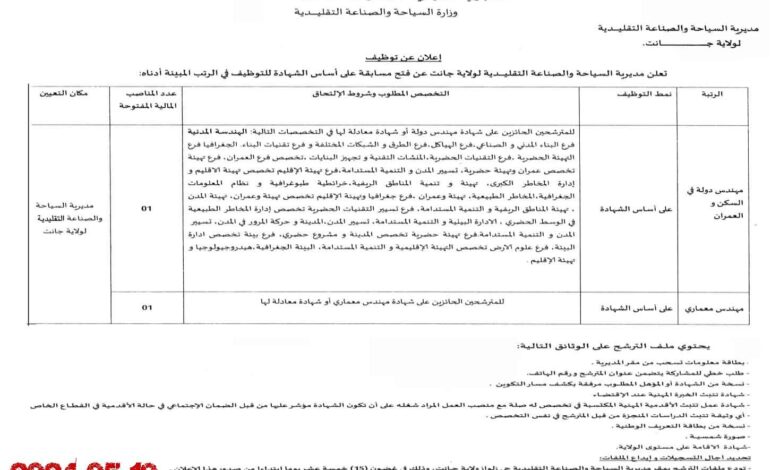 اعلان توظيف بمديرية السياحة والصناعة التقليدية لولاية جانت
