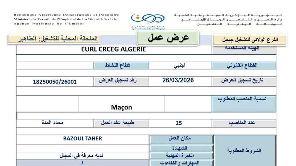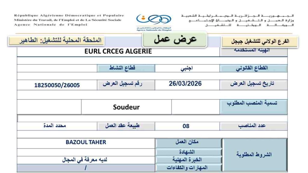 الهيئة المستخدمة: EURL CRCEG ALGERIE