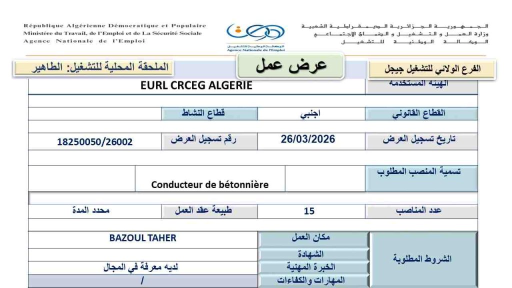 - Conducteur de bétonnière (سائق خلاطة خرسانة): 15 منصب