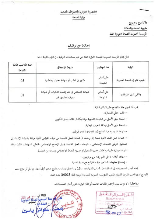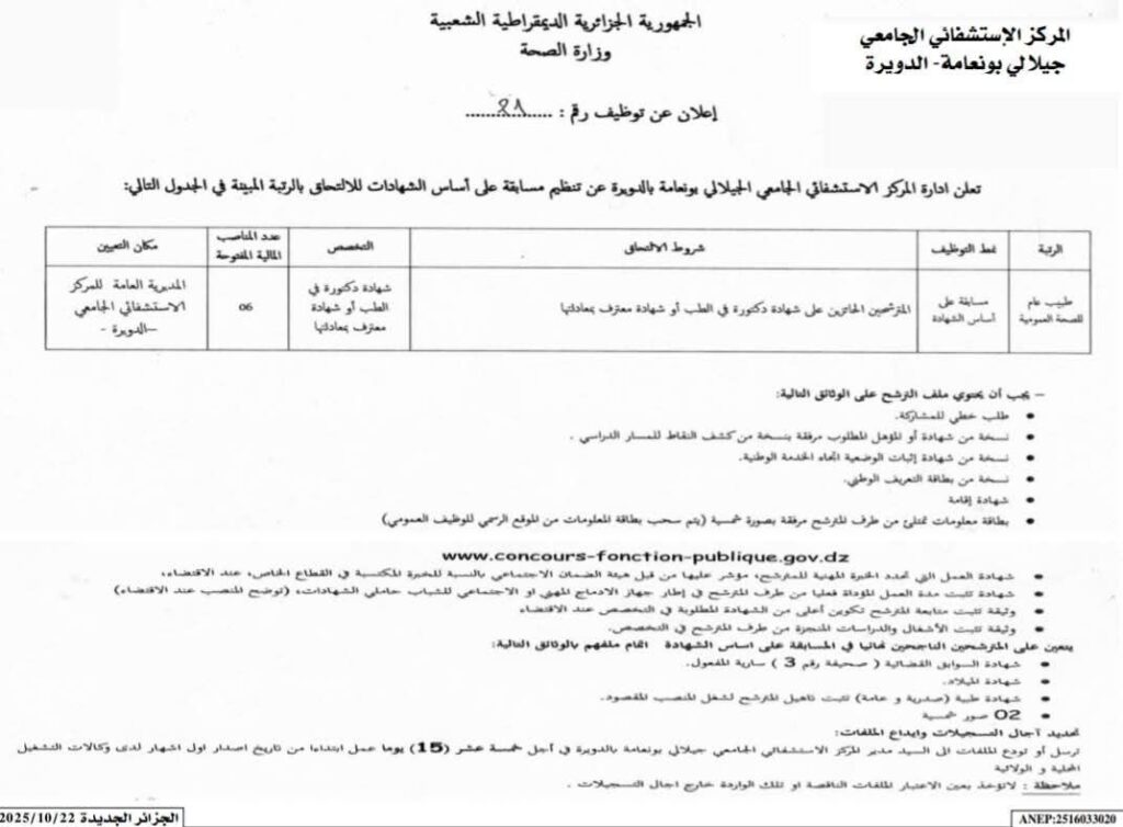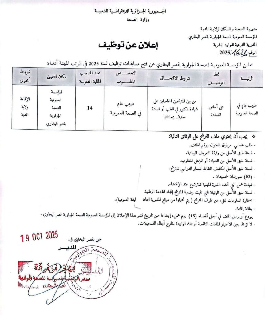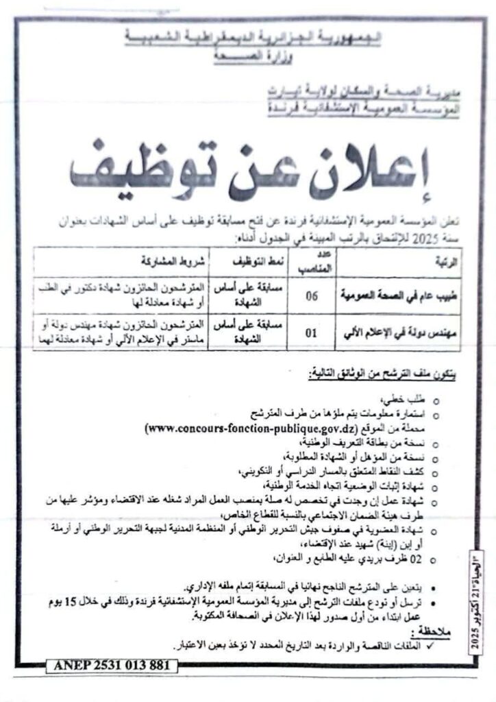 تعلن المؤسسة العمومية الاستشفائية عن فتح مسابقات توظيف للاطباء بولايات الجزائر.الجلفة.تيارت.المدية.برج بوعريرج