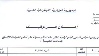 اعلان توظيف بلدية أذكار ولاية بجاية اعلان توظيف بلدية أذكار ولاية بجاية تعلن بلدية أذكار ولاية بجاية عن فتح…