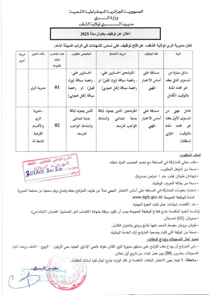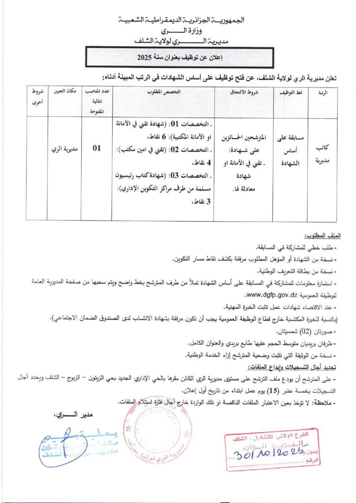 تعلن مديرية الري لولاية الشلف عن فتح توظيف على أساس الشهادة في الرتب المبينة :