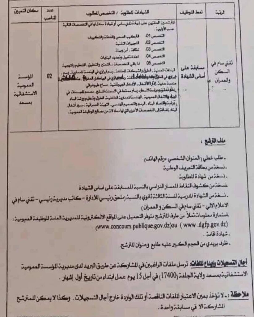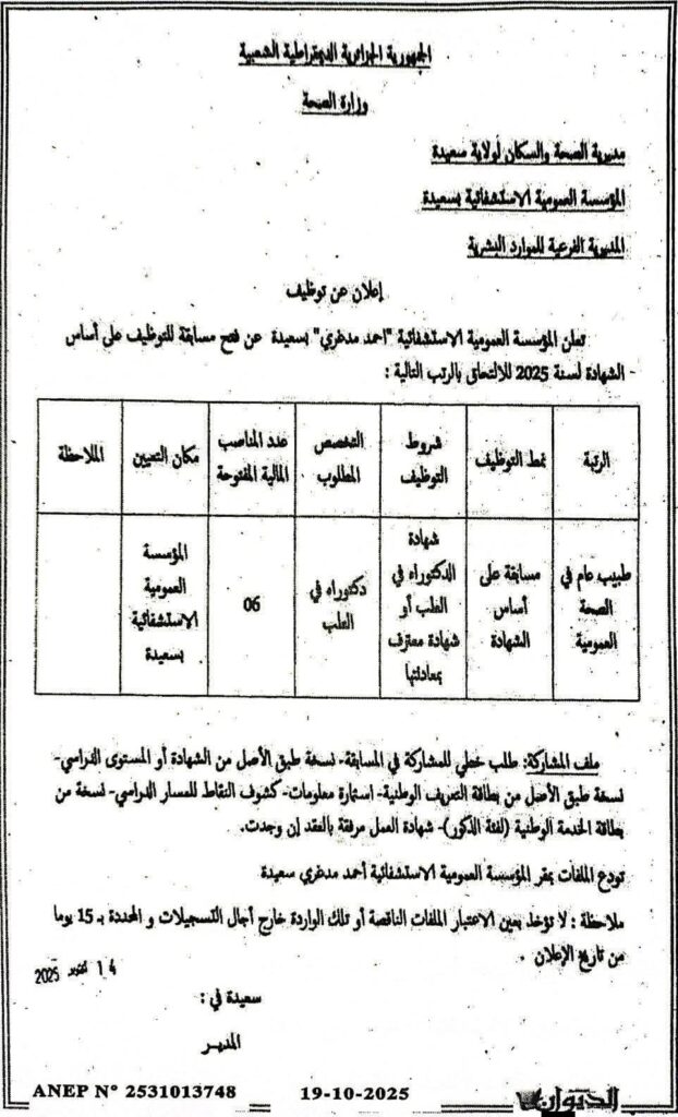 تعلن مديريات الصحة والسكان لولاية سعيدة والجلفة عن فتح مسابقات توظيف على اساس الشهادات لسنة 2025 للالتحاق بالرتب التالية