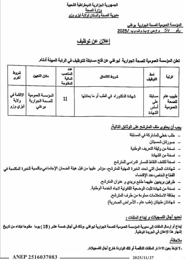 اعلان توظيف بمديرية الصحة والسكان لولاية ام البواقي وتيزي وزو