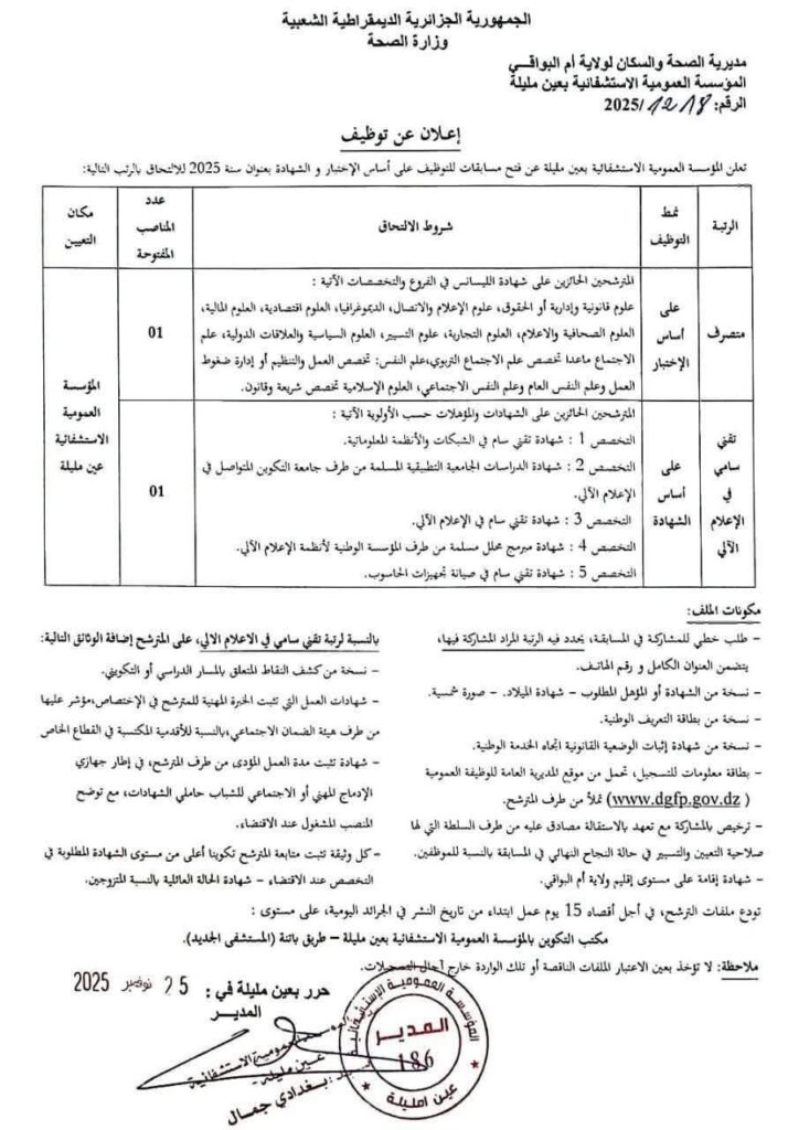 اعلان توظيف بمديرية الصحة والسكان لولاية ام البواقي وتيزي وزو