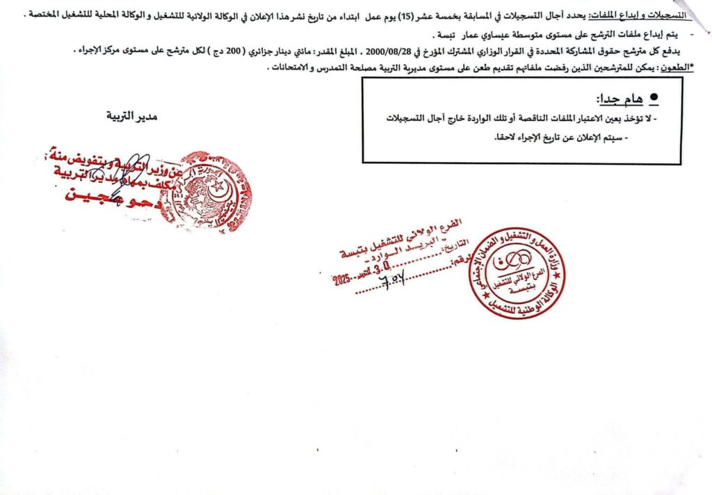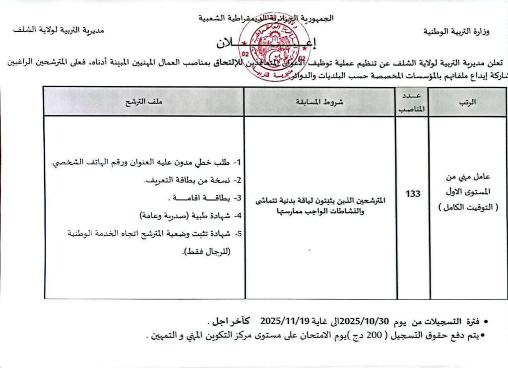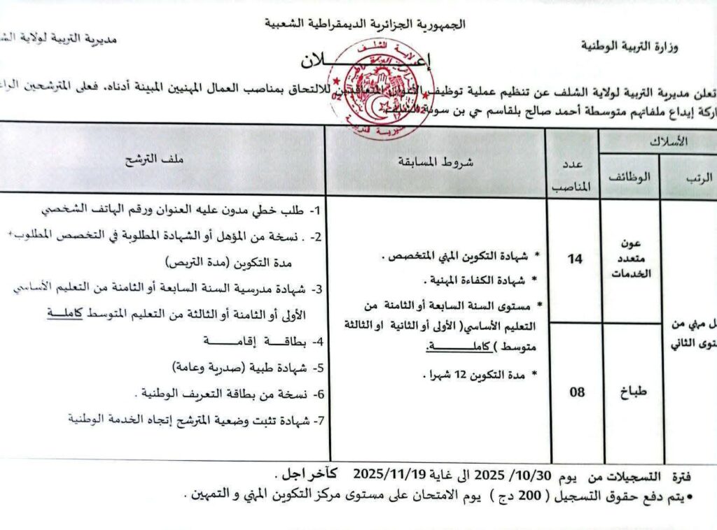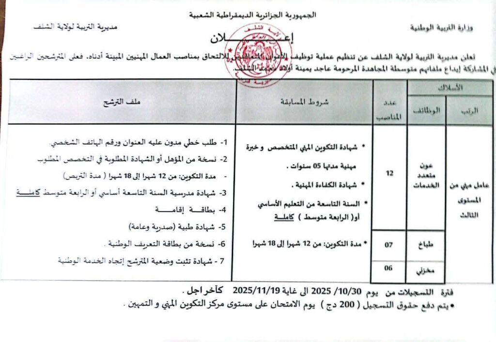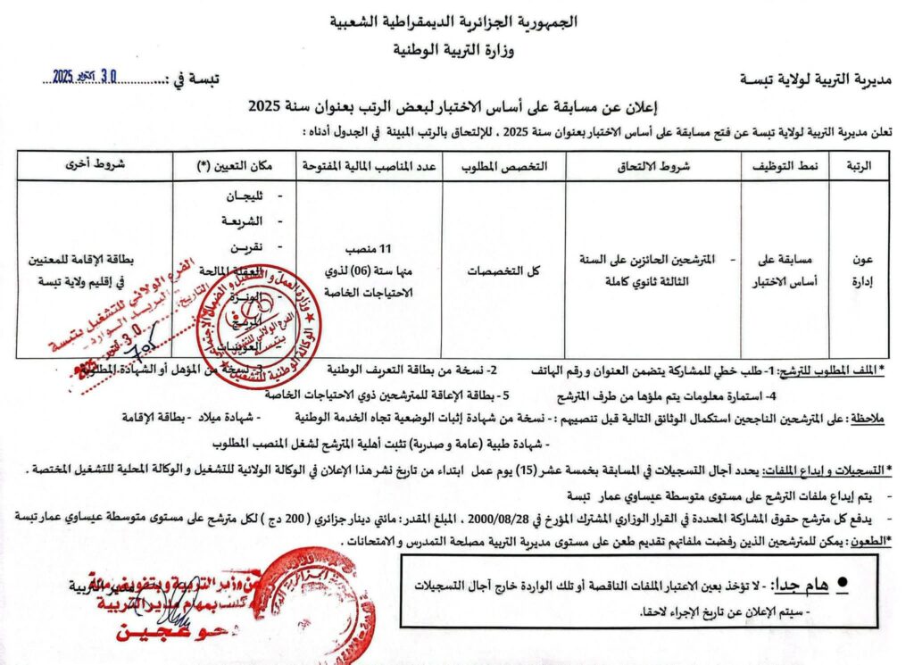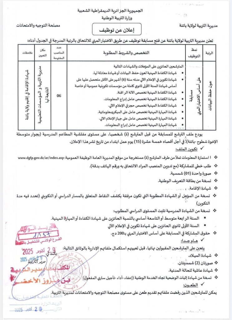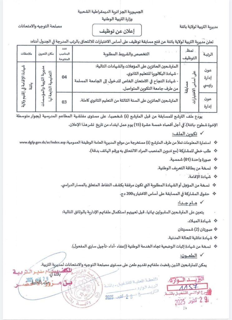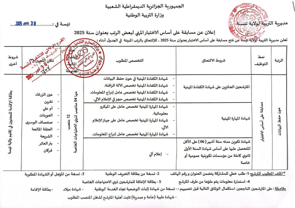 تعلن مديرية التربية لولاية باتنة وتبسة عن فتح مسابقات توظيف على اساس الاختبارات ومديرية التربية لولاية الشلف على أساس الاختبار المهني للالتحاق بالرتب التالية